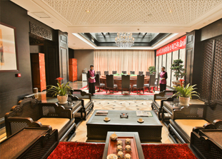 酒店定位為高性價(jià)比豪華主題餐飲酒店,以悠久的帝都?xì)v史和博大精深的河洛文化為載體,巧妙融入牡丹文化,并通過工藝品、名家書畫、詩詞、碑刻、石雕、水系景觀等方式,充分體現(xiàn)出洛陽的文化精髓,使“宴天下”品牌一躍成為帝都新貴。隨著五部觀光電梯在三樓緩緩?fù)O?,在門打開的同時(shí),一個(gè)居于繁華之上的大隱之境展現(xiàn)于眼前。尊崇闊麗的酒店大堂彰顯著皇家風(fēng)范,別具一格的宴會(huì)前廳顯得通達(dá)敞亮;漫步至三層的多功能宴會(huì)廳里, 6.8米高的無柱大廳顯得異常的高大寬廣、富麗堂皇,獨(dú)有58平米LED全彩高清背景屏、觸控星光大道、專業(yè)級(jí)舞美、多通道數(shù)字音響、特技電腦燈光、高清實(shí)況轉(zhuǎn)播等,讓我們感受到前衛(wèi)科技與時(shí)尚生活完美結(jié)合所帶來的震撼。