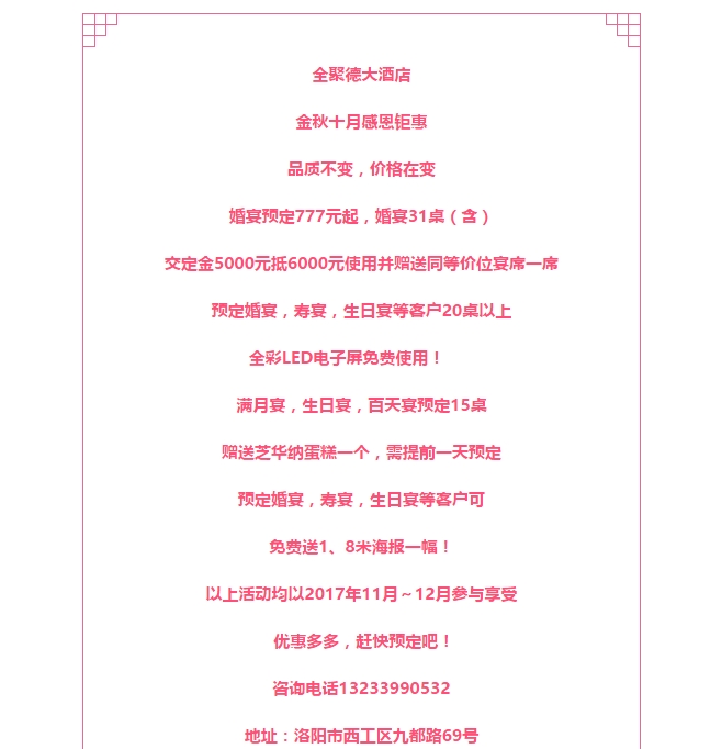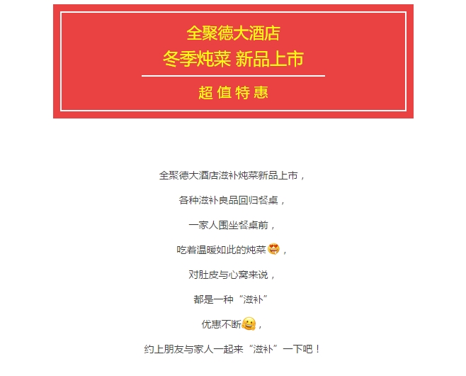 送溫暖!宴天下老城店新品燉菜火熱上市 讓這個冬天不再寒冷 發(fā)布時間:2017-10-27來源:點擊:2301 洛陽餐旅 宴會專家全國預(yù)訂客服熱線:400-616-3939微信號:hacyly股票代碼:836977長按二維碼識別后添加關(guān)注以上信息來源于洛陽餐旅集團(tuán)官網(wǎng):m.jqqty.cn 分享到:0 用手機(jī)看 拍下二維碼,信息隨身看 試試用微信掃一掃,在你手機(jī)上繼續(xù)觀看此頁面。 上一篇:河南省文物專家考察洛陽華夏喜慶文化博物館(籌) 并對藏品進(jìn)行鑒定 下一篇:送溫暖!全聚德大酒店新品燉菜火熱上市 讓這個冬天不再寒冷