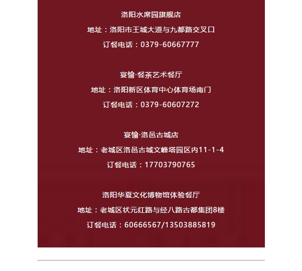 洛陽餐旅集團(tuán)旗下酒店 團(tuán)拜宴 | 年夜飯火熱預(yù)定中······ 發(fā)布時(shí)間:2017-11-28來源:點(diǎn)擊:2369 洛陽餐旅 宴會專家全國預(yù)訂客服熱線:400-616-3939微信號:hacyly股票代碼:836977長按二維碼識別后添加關(guān)注以上信息來源于洛陽餐旅集團(tuán)官網(wǎng):m.jqqty.cn 分享到:0 用手機(jī)看 拍下二維碼,信息隨身看 試試用微信掃一掃,在你手機(jī)上繼續(xù)觀看此頁面。 上一篇:宴愉一周歲了!感恩回饋生日趴 海鮮泡飯9.9元!超多優(yōu)惠等您來! 下一篇:中國食品安全報(bào)編輯部主任張基廷等一行參觀考察洛陽旅發(fā)集團(tuán)旗下華夏喜慶文化博物館