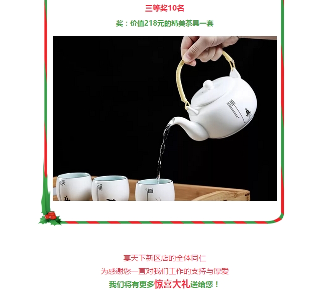 High翻平安夜 狂歡圣誕節(jié)丨盡在宴天下新區(qū)店 發(fā)布時間:2017-12-13來源:點擊:2426 洛陽餐旅 宴會專家全國預訂客服熱線:400-616-3939微信號:hacyly股票代碼:836977長按二維碼識別后添加關(guān)注以上信息來源于洛陽餐旅集團官網(wǎng):m.jqqty.cn 分享到:0 用手機看 拍下二維碼,信息隨身看 試試用微信掃一掃,在你手機上繼續(xù)觀看此頁面。 上一篇:雙十二 | 如果你是吃外賣的洛陽人,必看! 下一篇:High翻平安夜 狂歡圣誕節(jié)丨盡在全聚德大酒店