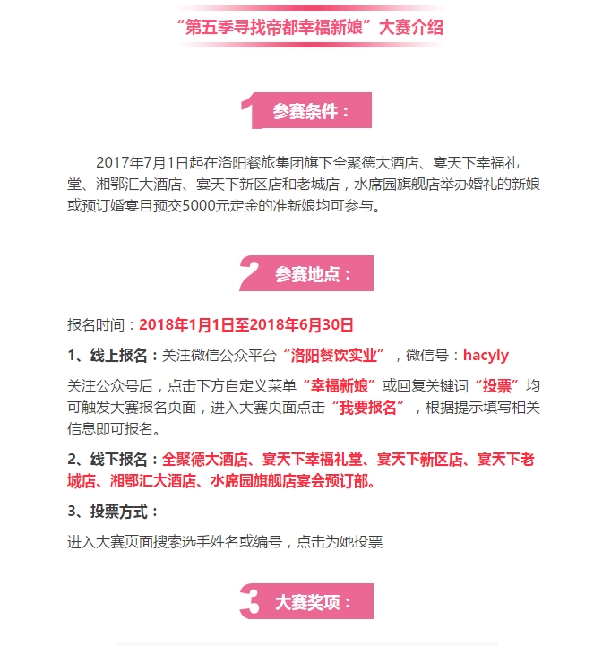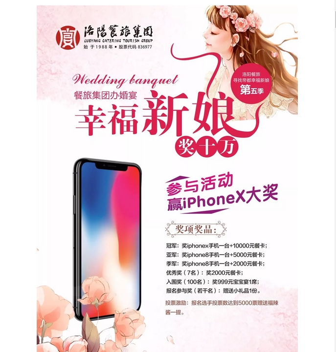 洛陽餐旅辦婚宴,幸福新娘獎十萬!第五季“尋找帝都幸福新娘”大型評選活動開始啦! 發(fā)布時間:2018-01-17來源:點擊:2960 洛陽餐旅 宴會專家全國預(yù)訂客服熱線:400-616-3939微信號:hacyly股票代碼:836977長按二維碼識別后添加關(guān)注以上信息來源于洛陽餐旅集團官網(wǎng):m.jqqty.cn 分享到:0 用手機看 拍下二維碼,信息隨身看 試試用微信掃一掃,在你手機上繼續(xù)觀看此頁面。 上一篇:洛陽餐旅集團旗下各店2018年2月-5月可預(yù)訂宴會日期一覽表(1.15更新) 下一篇:洛陽餐旅董事長申靈杰獲餐飲世界年度貢獻獎