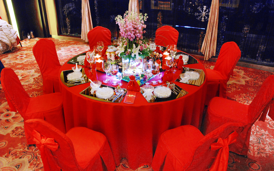 新區(qū)店餐臺整體以中國紅為主要元素,獨特的水晶鏡面餐臺中央擺放著插滿紫羅蘭與百合的花束,暗香浮動,在熒熒燭火的點綴下,流光溢彩,浪漫溫馨。